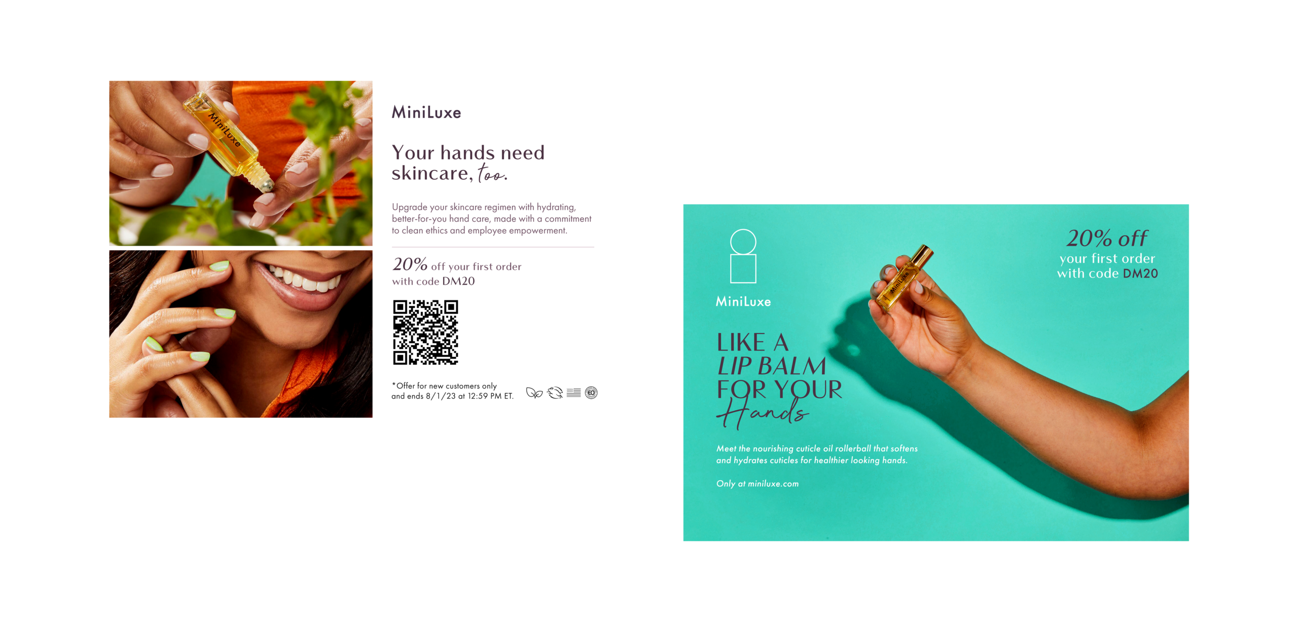 The mailer is designed to grab attention quickly, using product-led imagery and clear type so the product and offer are easy to understand at a glance. The in-studio screens shift away from selling and focus on the experience, using bold visuals and affirming messaging to reflect MiniLuxe’s commitment to inclusivity during Pride Month.