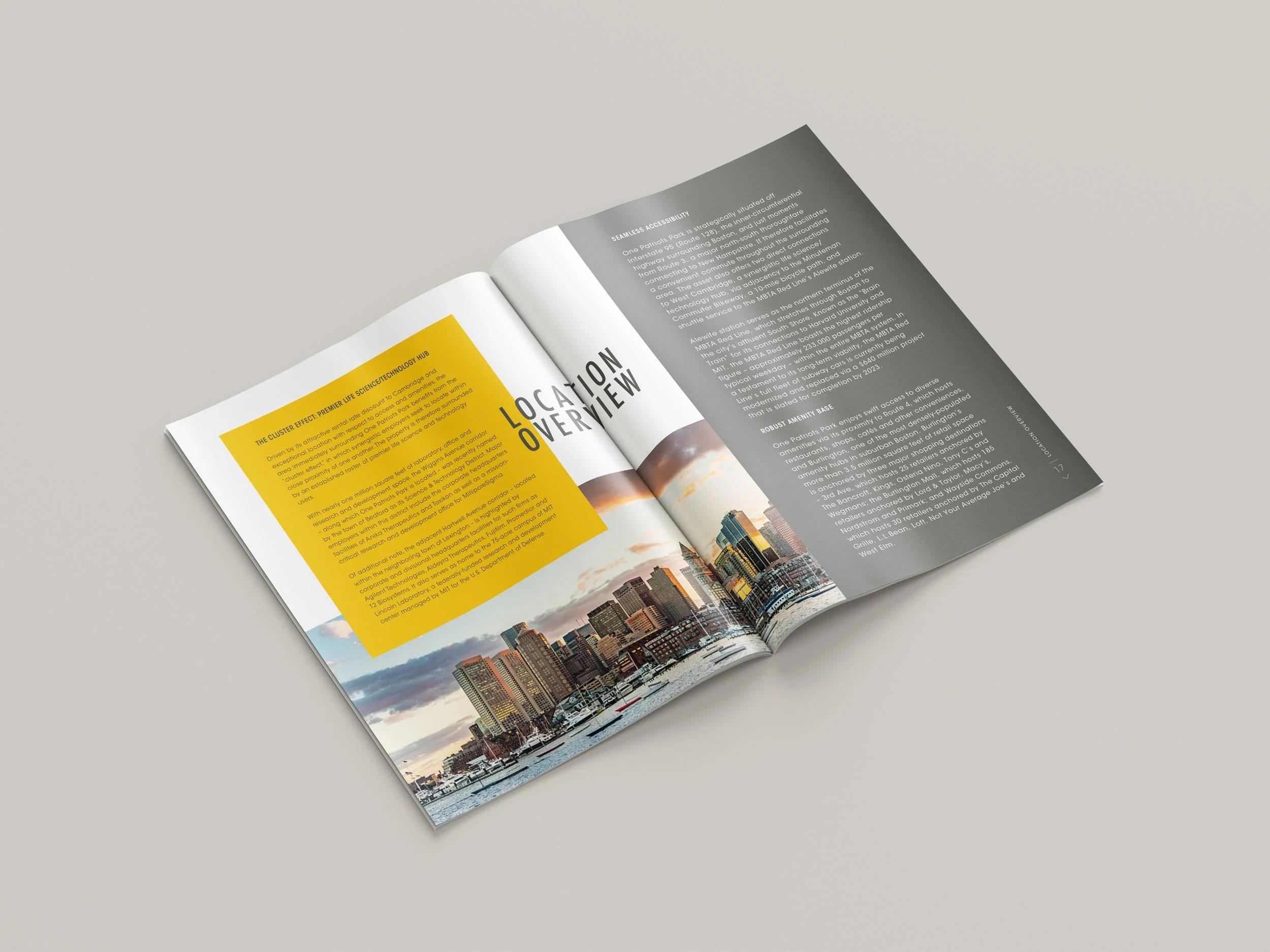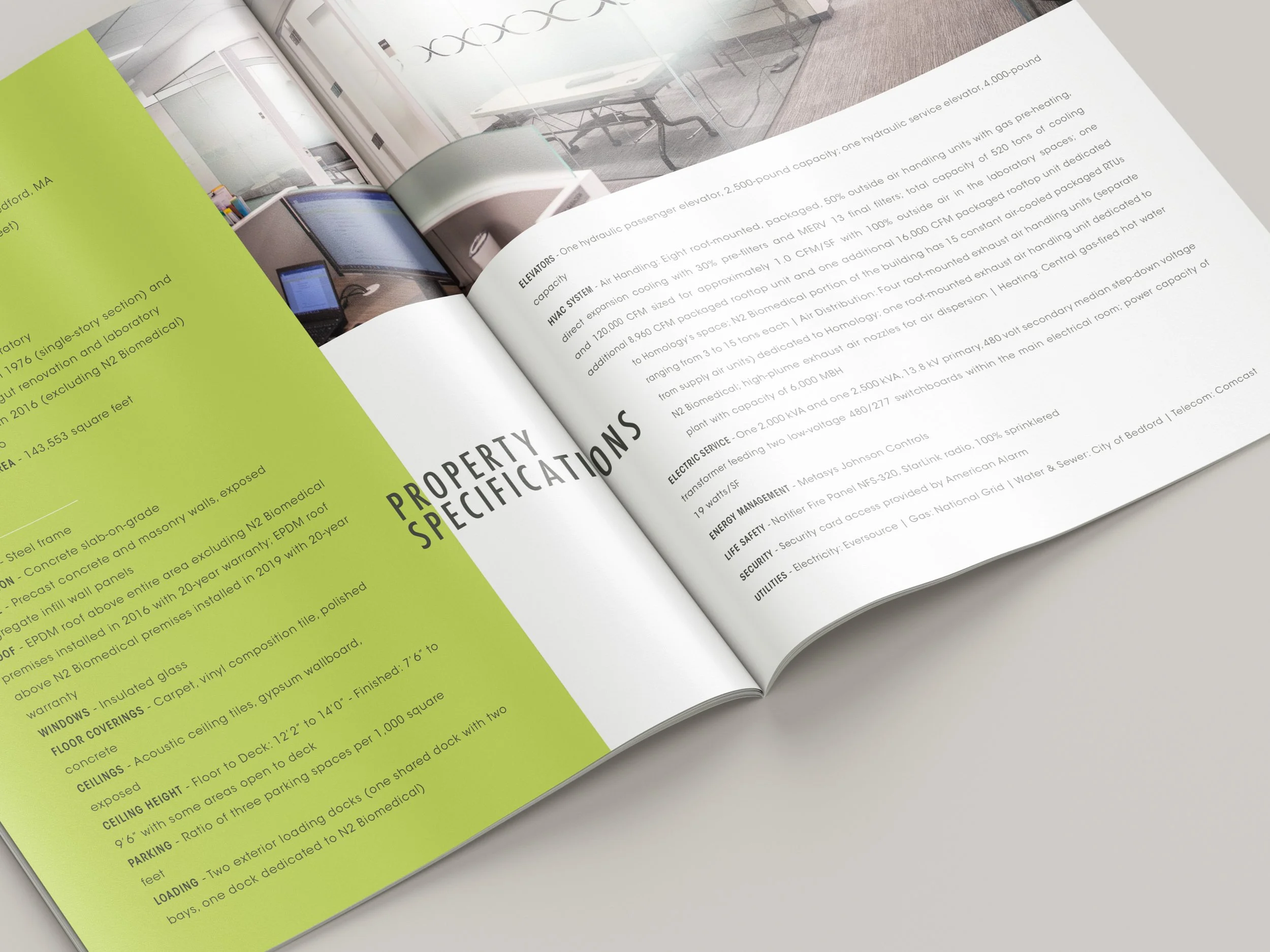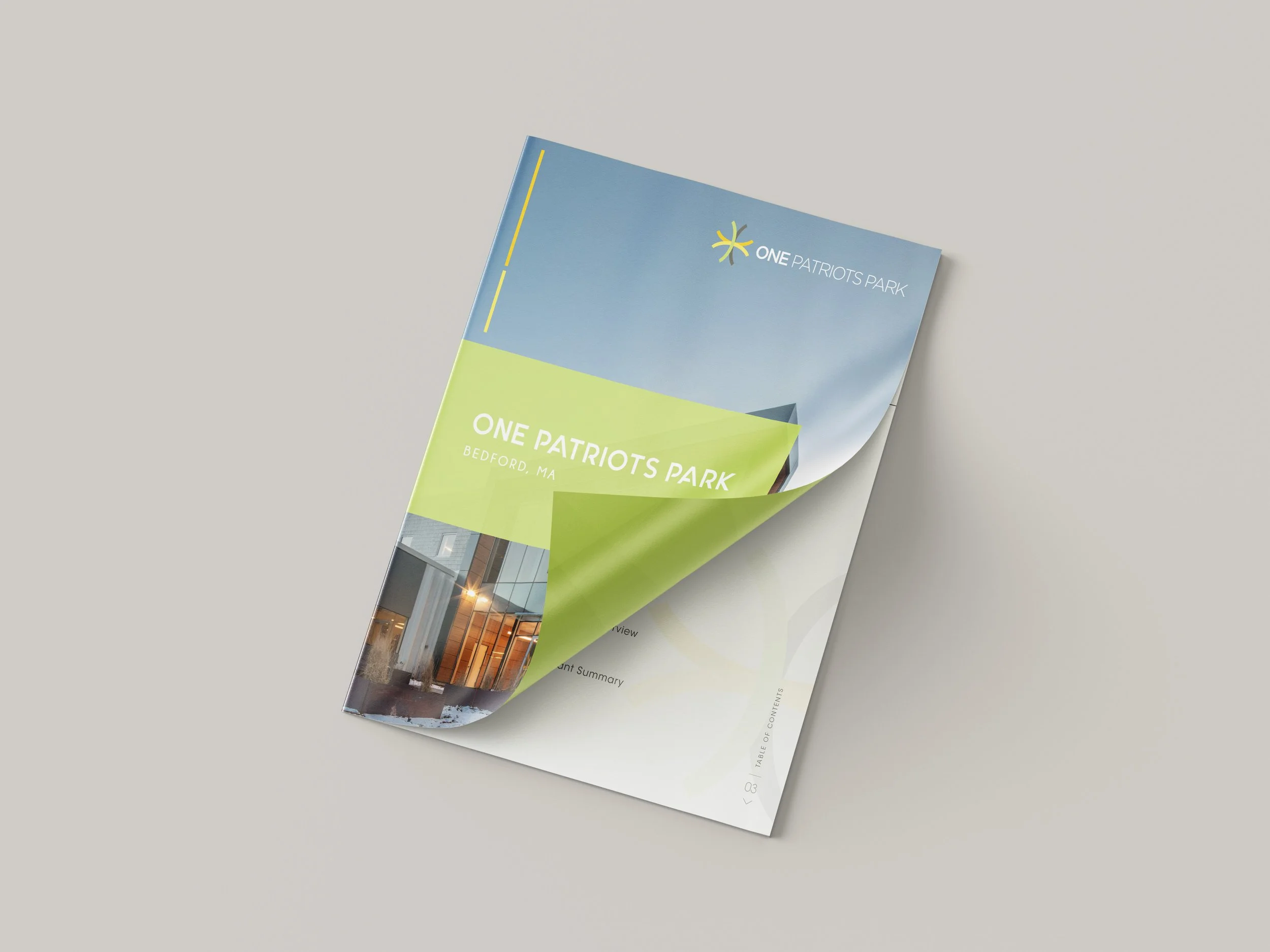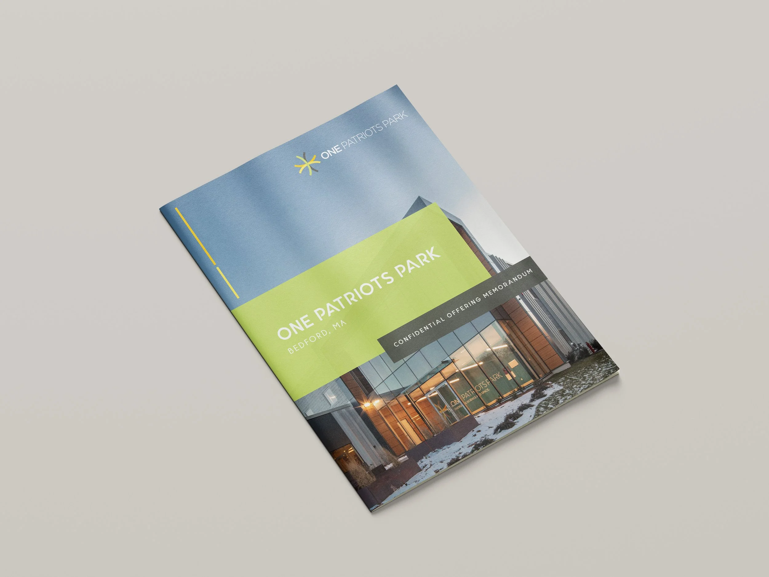 I designed a full offering memorandum for One Patriots Park, a modern commercial property in Bedford, MA. The goal was to create a polished, investor-ready presentation that felt as refined as the space itself. Using the existing logo, copy, and photography, I built a clean grid system, introduced a bright yet balanced color palette, and organized the content into a visually intuitive flow. The result was a cohesive, professional piece that highlighted the property’s value and positioned it confidently in the market.